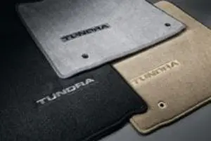 Custom-Tailored for an exact fit to your Tundra?s Floor pattern, the carpet Floor mats are constructed of high-grade plush nylon carpet, Color-matched to your vehicle?s Interior and include an embroidered Tundra Logo. An aggressive no-slip backing helps keep the mats in position, protecting your original carpet from premature wear and stains. They?re also removable and easy to Clean. Fits Tundra Color: Graphite Logo: With Logo Number of Pieces: 4 To avoid interference with Pedal opeRation: Each mat must be secured with retention hooks (clips) Do not install a Floor mat on top of an existing Floor mat This Floor mat was designed specifically for use in this model and model year vehicle and SHOULD NOT be used in any other vehicle Constructed of 16 oz. Color-matched to your vehicle's interior. Protects the original carpet from stains and excessive wear. BCF nylon carpet featuring embroidererd vehicle name, aggressive nibs and retention clip.